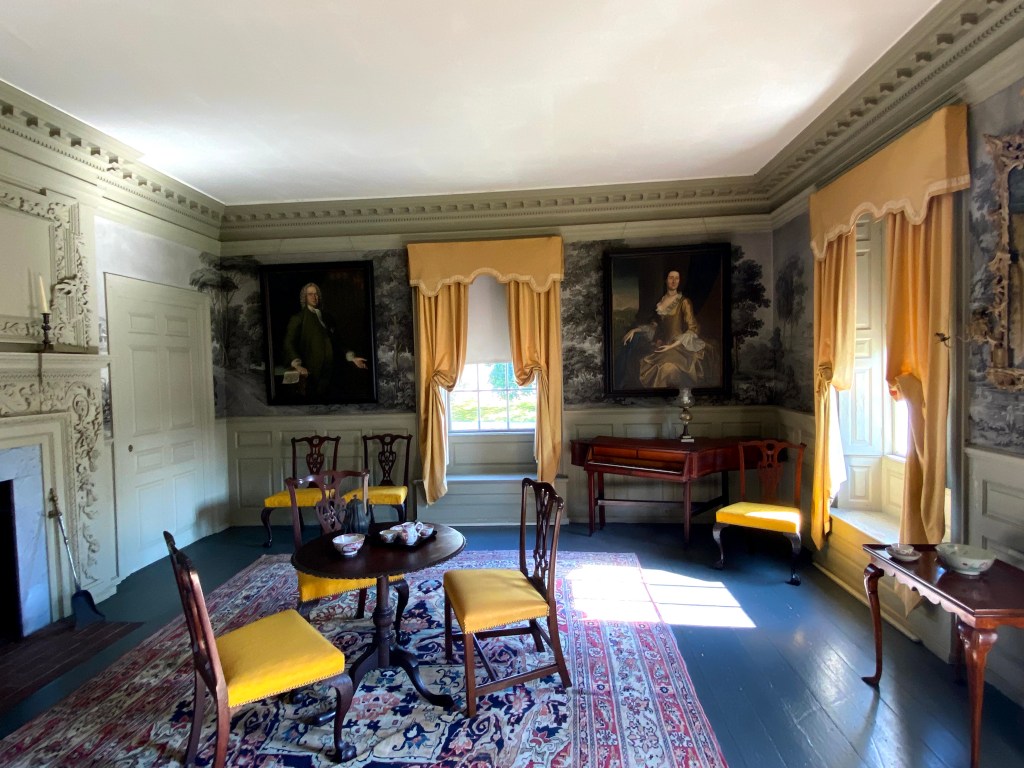 This room would have been used for smaller, more intimate social gatherings, such as inviting your good friend George Washington over for a casual afternoon tea. I’m simply obsessed with the dentil trim, the splashes of yellow and the insane 3D wooden fireplace featuring the King’s Board over the mantel. This was a wealthy way to flip the bird to King George at the time, as any lumber measuring over a certain size was considered the King’s and was supposed to be shipped back to England. Today we may look at the fireplace and think a painting or mirror must have hung there, but the actual focus was the sheer size of the single plan of wood – just imagine how huge that tree had to be! You can also see King’s Wood shown off in the entryway, along the left side of the staircase there is one solid HUGE board that runs the entire length of the stairs. You’ll start noticing them everywhere now!